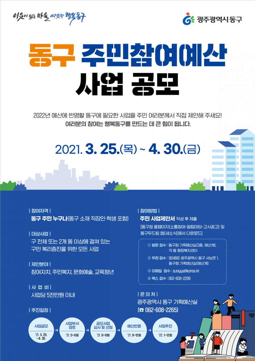 [°ø°£´º½º = ±è´ë¿µ±âÀÚ] ±¤ÁÖ µ¿±¸(±¸Ã»Àå ÀÓÅÃ)´Â ÁÖ¹ÎÀÌ ¿¹»êÆí¼º °úÁ¤¿¡ Á÷Á¢ Âü¿©ÇØ ÇÊ¿äÇÑ »ç¾÷À» Á¦¾ÈÇϱâ À§ÇÑ 2022³â ÁÖ¹ÎÂü¿©¿¹»ê »ç¾÷ °ø¸ð¸¦ ¿À´Â 4¿ù30ÀϱîÁö ½Ç½ÃÇÑ´Ù°í ¹àÇû´Ù.