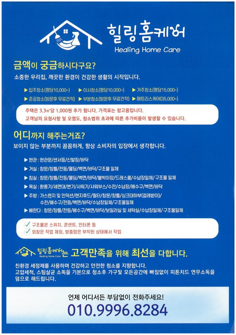Èú¸µÈ¨Äɾî´Â ¡ãÀÔÁÖû¼Ò(Æò´ç10,000¿ø), ¡ãÀÌ»çû¼Ò(Æò´ç10,000¿ø), ¡ã°ÅÁÖû¼Ò(Æò´ç15,000¿ø), ¡ã¸ÅÆ®¸®½ºÄɾî(35,000¿ø)À¸·Î °¡°ÝÀ» Ã¥Á¤Çß°í, ¡ãÁذøÃ»¼Ò¡¤ºÎºÐû¼Ò´Â ¹æ¹® ÈÄ °¡°ÝÀ» °áÁ¤ÇÏ¿© ½ÃÁߺ¸´Ù Àú·ÅÇÑ °¡°ÝÀ¸·Î ¾çÁúÀÇ Ã»¼Ò¼ºñ½º¸¦ Á¦°øÇÑ´Ù.