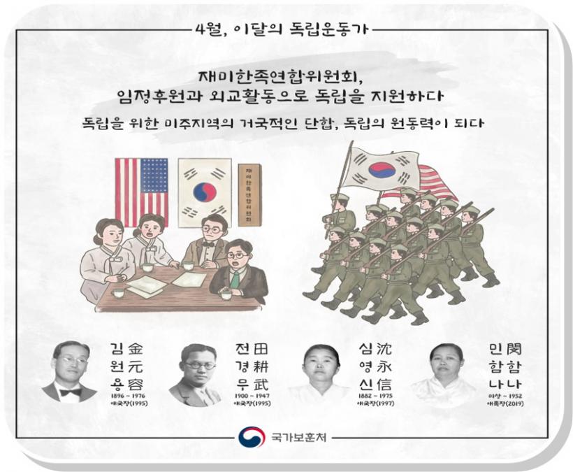 ±×¸®°í µ¶¸³¿îµ¿ ´Üü¸¦ ÅëÀÏÇÏ°í ´ëÇѹα¹ÀÓ½ÃÁ¤ºÎ¸¦ Áö¿øÇϱâ À§ÇÑ ¡®Àç¹ÌÇÑÁ·¿¬ÇÕÀ§¿øÈ¸¡¯¶ó´Â ¿¬ÇÕ±â°üÀ» ¼³Ä¡Çß´Ù. ³× ¸íÀÇ ¼±»ýÀº ¹ÌÁÖÁö¿ªÀÇ µ¶¸³¿îµ¿ ¿¬ÇÕ´ÜüÀÎ ¡®Àç¹ÌÇÑÁ·¿¬ÇÕÀ§¿øÈ¸¡¯¸¦ À̲ö ÁÖ¿ªµé·Î, ´ëÇѹα¹ÀÓ½ÃÁ¤ºÎ ÈÄ¿ø°ú ¿Ü±³È°µ¿À¸·Î µ¶¸³À» Áö¿øÇß´Ù.