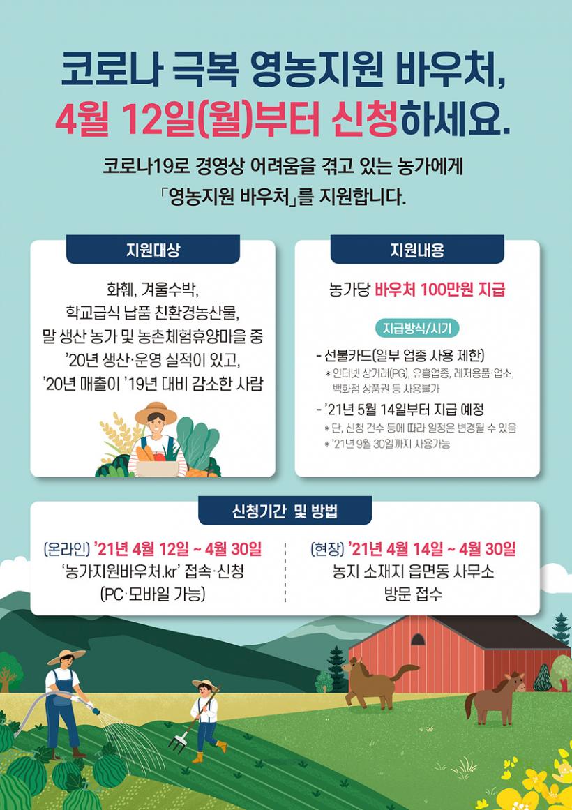 ÇÑÆí À̹ø ¿µ³óÁö¿ø ¹Ù¿ìó´Â ±ä±Þ°í¿ë¾ÈÁ¤Áö¿ø±Ý, ¼Ò»ó°øÀÎ ¹öÆÀ¸ñÀÚ±Ý Ç÷¯½º, Çѽûý°èÁö¿ø±Ý, Äڷγª ±Øº¹ ¿µ¾î Áö¿ø ¹Ù¿ìó, Äڷγª ±Øº¹ ¿µ¸² Áö¿ø ¹Ù¿ìó µî°ú Áߺ¹¼ö±ÞÀÌ ºÒ°¡ÇÏ´Ù. ´Ù¸¸ ¼Ò±Ô¸ð ³ó°¡ Çѽà °æ¿µÁö¿ø ¹Ù¿ìó¿Í´Â Áߺ¹ Áö±ÞµÈ´Ù.