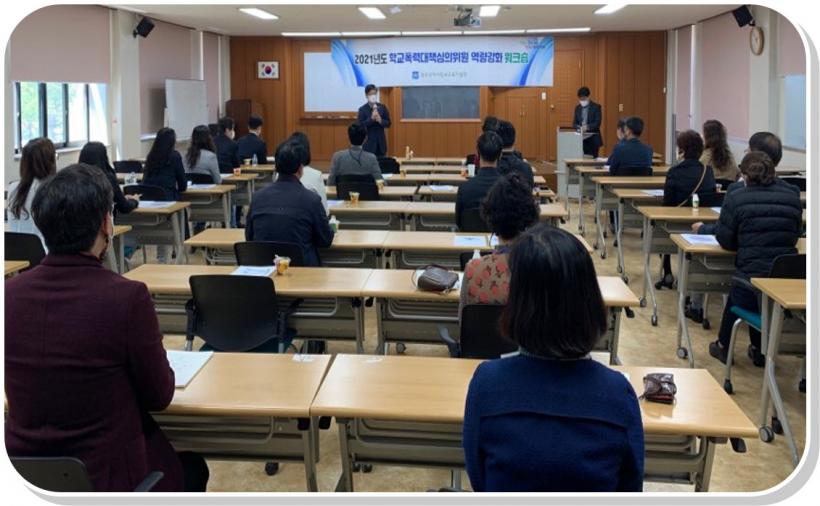 ¿öÅ©¼óÀº 2021³â °³Á¤µÈ »ç¾È󸮳»¿ëÀ» ¹Ý¿µÇØ ÇÇÇØÇлý º¸È£ ¹× °øÁ¤ÇÑ ±³À°Àû Á¶Ä¡¸¦ À§ÇÑ ¿ª·® °È¿¡ ÁßÁ¡À» µÎ°í ÁøÇàµÆ´Ù. Çб³Æø·Â´ëÃ¥½ÉÀÇÀ§¿ø ¹× ¾÷¹«´ã´çÀÚ µî 35¸íÀÌ Âü¼®Çß°í, Äڷγª19 ¿¹¹æÀ» À§ÇÑ Çб³Æø·Â´ëÃ¥½ÉÀÇÀ§¿øÈ¸¿î¿µ ¸Å´º¾óÀ» ÁؼöÇß´Ù.