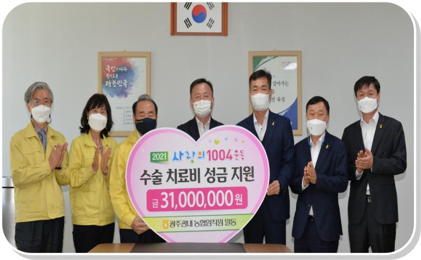 ±¤Áֽñ³À°Ã»ÀÇ ¡®The ÇູÇÑ µ¿Ç࡯¿¡ ÇÔ²² Çϰí ÀÖ´Â ³óÇùÁß¾Óȸ ±¤ÁÖÁö¿ªº»ºÎ°¡ ÃßÁøÇÏ´Â ¡®»ç¶ûÀÇ 1004¿îµ¿¡¯Àº ÀÓÁ÷¿øÀÇ ¸ð±ÝÀ» ÅëÇØ ¾î·Á¿î ÀÌ¿ô¿¡ Ä¡·áºñ¿Í ¼ö¼úºñ¸¦ Áö¿øÇÏ´Â »ç¾÷ÀÌ´Ù.