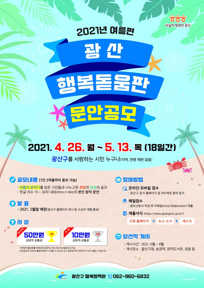 ÇÑÆí ±¤»ê±¸´Â °èÀý¸¶´Ù ±¤»êÇູµ¸¿òÆÇ ¹®¾È °ø¸ð¸¦ ÁøÇàÇÒ °èȹÀÌ´Ù. ¾Õ¼ Áö³ 2¿ù¿£ º½Æí Çູµ¸¿òÆÇ °ø¸ð°¡ ÁøÇàµÅ ¹è¼¿µ ¾¾ÀÇ ¡°Èñ¸ÁÀº º½°ú ÇÔ²² ¿À°í, ÇູÀº ³Ê¿Í ÇÔ²² ¿Â´Ù¡±°¡ ¼±Á¤µÈ ¹Ù ÀÖ´Ù.