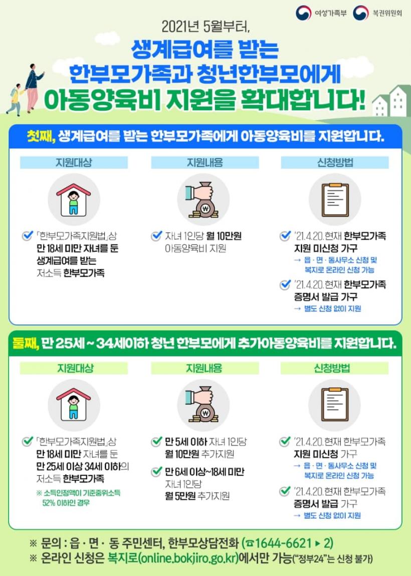 ƯÈ÷ ¸¸ 25¡34¼¼ û³â ÇѺθ𠰡Á· Àڳ࿡°Ôµµ ¿ù 5¸¸¡10¸¸ ¿ø Ãß°¡ ¾Æµ¿¾çÀ°ºñ°¡ Áö±ÞµÈ´Ù. ±âÁ¸¿¡ ¸¸ 24¼¼±îÁö û¼Ò³â ÇѺθ𿡰Ը¸ Áö¿øÇÏ´ø Ãß°¡ ¾Æµ¿¾çÀ°ºñ¸¦ û³â ÇѺθ𿡰Եµ Ãë¾÷À̳ª ÀÚ¸³ »óȲÀ» °í·ÁÇØ Áö¿øÅä·Ï È®´ëÇÑ °ÍÀÌ´Ù.