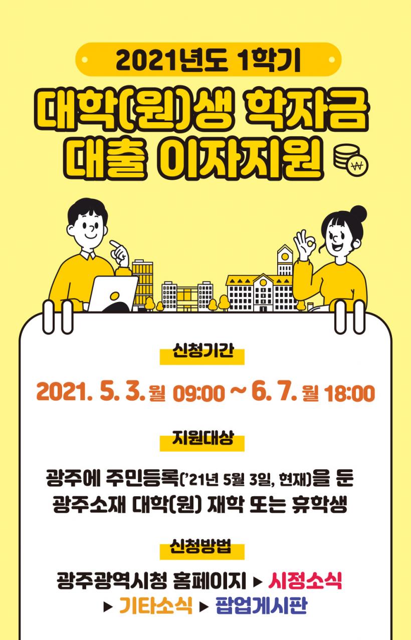 [°ø°£´º½º = ±è¼ö±Ù±âÀÚ] ±¤ÁÖ±¤¿ª½Ã´Â ¿À´Â 6¿ù7ÀϱîÁö 2021³âµµ 1Çб⠴ëÇÐ(¿ø)»ý ÇÐÀڱݴëÃâ ÀÌÀÚÁö¿ø ½ÅûÀ» Á¢¼öÇÑ´Ù.