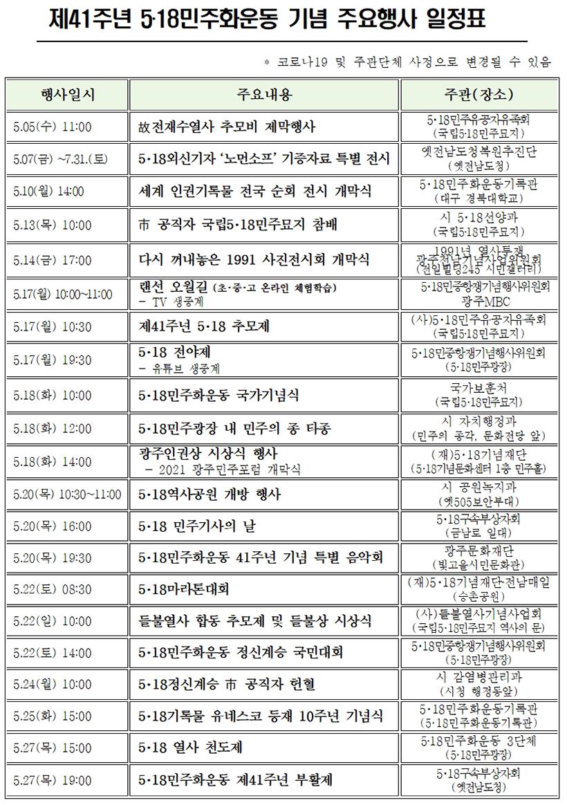 À̹ø ±â³äÇà»ç´Â ±¤ÁÖ½Ã¿Í ±¹°¡º¸ÈÆÃ³, °ü·Ã °ø°ø±â°ü, 5‧18¹ÎÁßÇ×Àï±â³äÇà»çÀ§¿øÈ¸, 5¿ù ´Üü, 5‧18±â³äÀç´Ü µîÀÌ ÁÖ°üÇÏ´Â Çà»ç·Î ³ª´² ÁøÇàµÈ´Ù.