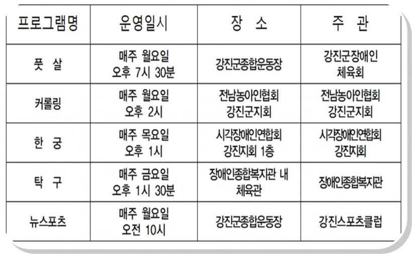 ÀÚ¼¼ÇÑ »çÇ×Àº °Áø±ºÀå¾ÖÀÎüÀ°È¸ ȨÆäÀÌÁö(http://www.gajsad.or.kr)¿¡¼ È®ÀÎÇÒ ¼ö ÀÖÀ¸¸ç, Âü°¡¸¦ Èñ¸ÁÇÏ´Â Àå¾ÖÀÎÀº ±ºÀå¾ÖÀÎüÀ°È¸ »ç¹«±¹ ¶Ç´Â °Áø½ºÆ÷Ã÷Ŭ·´, »ç)Çѱ¹½Ã°¢Àå¾ÖÀο¬ÇÕȸ °ÁøÁöȸ, »ç)Àü³²³ó¾ÆÀÎÇùȸ °Áø±ºÁöȸ, °Áø±ºÀå¾ÖÀÎÁ¾ÇÕº¹Áö°ü¿¡ °¢°¢ ¹®ÀÇÇÏ¸é µÈ´Ù.