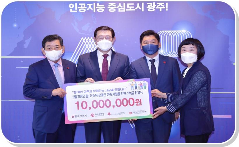 ¢ß±¤Áֽż¼°è´Â ¡®Àå¾ÖÀÎ °¡Á·°ú ÇÔ²²ÇÏ´Â ¼¼»óÀ» ¸¸µì´Ï´Ù¡¯¶ó´Â Ä·ÆäÀÎÀ» ÅëÇØ ¸¶·ÃÇÑ ¼öÀÍ±Ý 1000¸¸¿øÀ» Àú¼Òµæ Àå¾ÖÀÎ °¡Á· Áö¿øÀ» À§ÇØ ±¤ÁÖ»çȸº¹Áö°øµ¿¸ð±Ýȸ¿¡ ±âŹÇÏ°í ±¤ÁÖÀå¾ÖÀκθ𿬴뿡 Àü´ÞÇß´Ù.