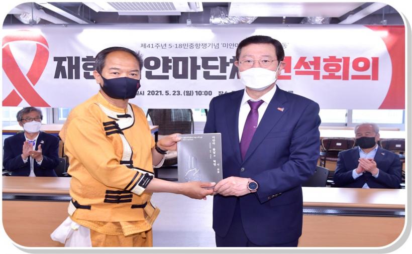 À̳¯ Çà»ç¿¡ Âü¼®ÇÑ À̿뼷 ±¤ÁÖ±¤¿ª½ÃÀåÀº ¹Ì¾á¸¶´Üü ´ëÇ¥µé¿¡°Ô 5¡¤18¹èÁö¸¦ ´Þ¾ÆÁÖ¸ç ¡°±¤ÁֽùεéÀº ³ª´®°ú ¿¬´ëÀÇ ±¤ÁÖÁ¤½ÅÀ¸·Î ¹Ì¾á¸¶ ±¹¹ÎµéÀ» Àû±Ø Áö¿øÇϰí ÀÖÀ¸¸ç, ±¤Áֽô ±×µ¿¾È ±¸ÃàÇÑ ±¹Á¦ ÀÎ±Ç³×Æ®¿öÅ©¸¦ ÅëÇØ ±¹Á¦»çȸ¿¡ ¹Ì¾á¸¶ »çÅ¿¡ ´ëÇÑ °ü½É°ú ¿¬´ë¸¦ °·ÂÈ÷ Ã˱¸Çϰí ÀÖ´Ù¡±°í ¹àÇû´Ù.