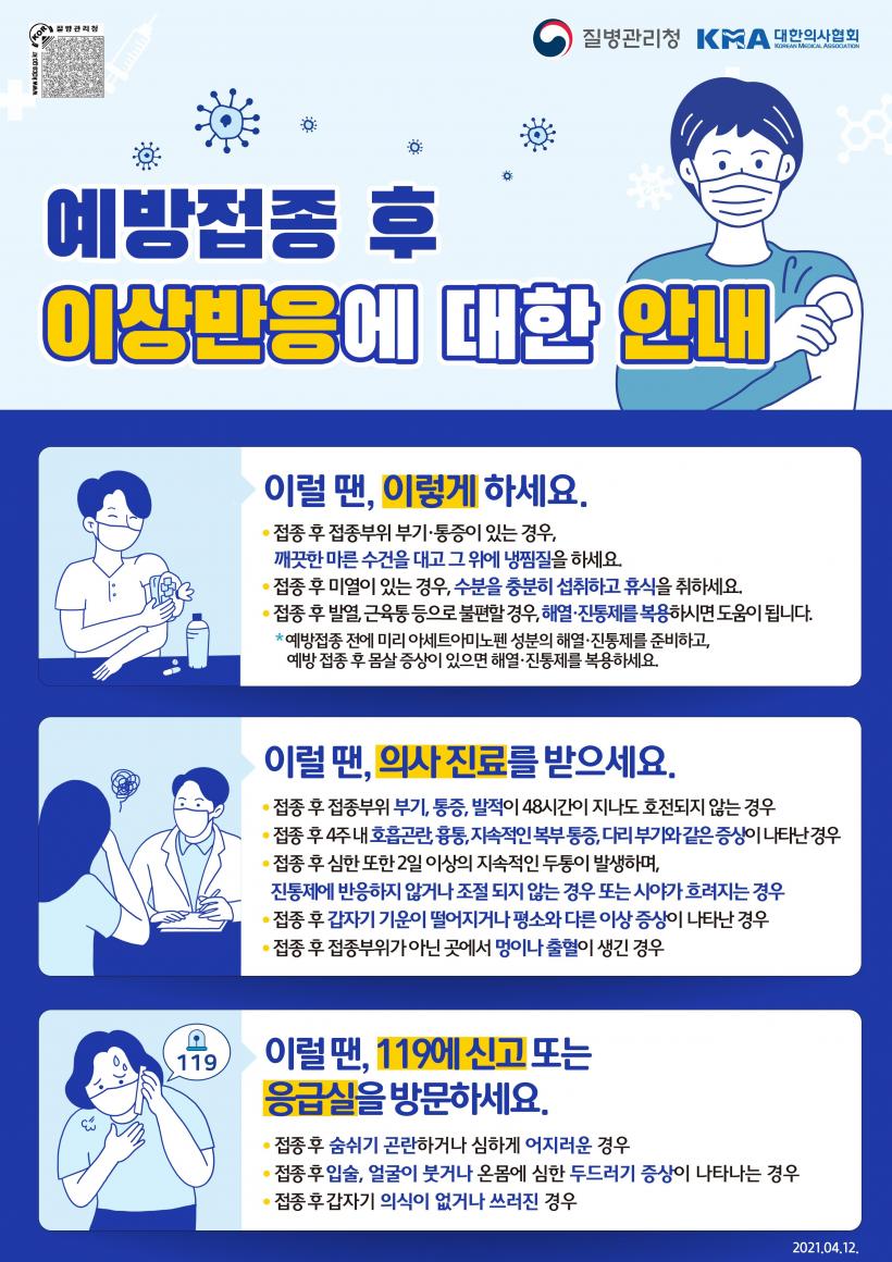 Äڷγª19 ¿¹¹æÁ¢Á¾ ÈÄ ÀÌ»ó¹ÝÀÀÀ¸·Î ¹ß¿, ÇǷΰ¨, µÎÅë, ±ÙÀ°Åë, ¸Þ½º²¨¿ò¤ý±¸Åä µîÀÇ Àü½Å¹ÝÀÀÀÌ ³ªÅ¸³¯ ¼ö ÀÖÀ¸³ª, ÀÌ·¯ÇÑ ÀÌ»ó¹ÝÀÀÀº ´ëºÎºÐ ¼öÀÏ(3ÀÏ) ³» Áõ»óÀÌ »ç¶óÁø´Ù. ÀÌ·¯ÇÑ Áõ»óÀÌ ³ªÅ¸³¯ °æ¿ì ¼öºÐÀ» ¼·ÃëÇϰí ÃæºÐÇÑ ÈÞ½ÄÀ» ÃëÇÏ´Â °ÍÀÌ ÇÊ¿äÇÏ´Ù.