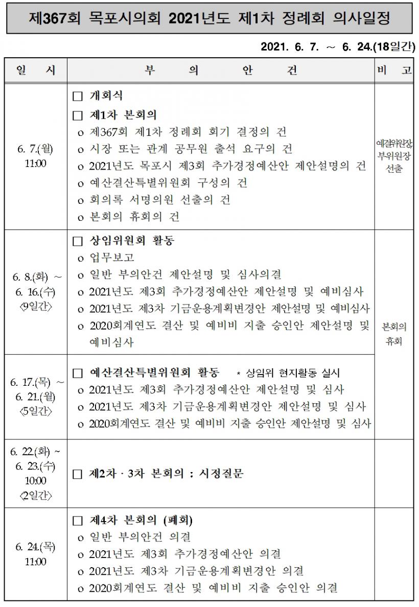[°ø°£´º½º = ±è¿ëÁø±âÀÚ] ¸ñÆ÷½ÃÀÇȸ(ÀÇÀå ¹Úâ¼ö)´Â 7ÀϺÎÅÍ 24ÀϱîÁö 18Àϰ£ÀÇ ÀÏÁ¤À¸·Î Á¦367ȸ Á¦1Â÷ Á¤·Êȸ¸¦ ¿î¿µÇÑ´Ù.