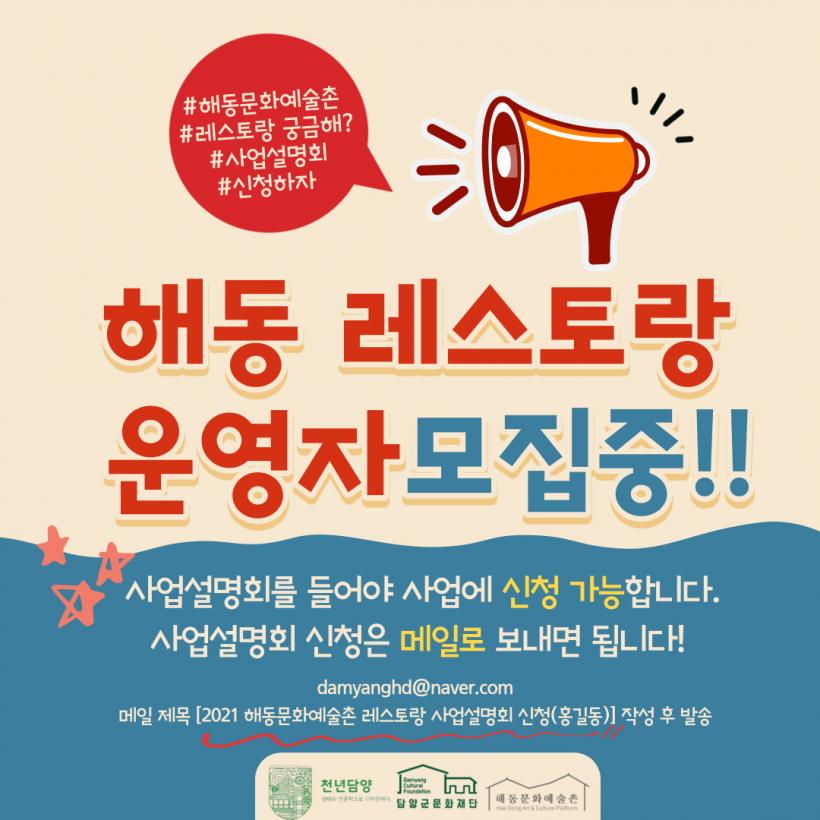 »ç¾÷¼³¸íȸ ½ÅûÀº Á¦¸ñ [2021 ÇØµ¿¹®È¿¹¼úÃÌ ·¹½ºÅä¶û »ç¾÷¼³¸íȸ ½Åû(È«±æµ¿)]À» ÀÛ¼ºÇØ ÇØµ¿¹®È¿¹¼úÃÌ ¸ÞÀÏ damyanghd@naver.comÀ¸·Î º¸³»¸é µÈ´Ù.
