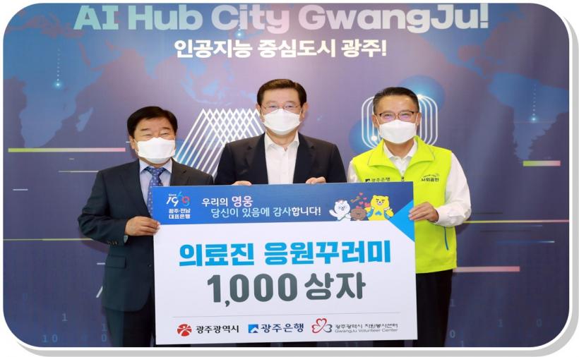 ±¤ÁÖÀºÇàÀº ¹«´õÀ§ ¼Ó ½Ã¿øÇÔÀ» ´õÇÏ´Â ¾Ë·Î¿¡ ¹Ì½ºÆ®, ºÎä µîÀÇ ¿©¸§¿ëǰ°ú È«»ï, Àüº¹Á× µîÀÇ °Ç°½Äǰ 17Á¾ÀÌ ´ã±ä ÀÀ¿ø²Ù·¯¹Ì 1000°³(5000¸¸¿ø »ó´ç)¸¦ ±¤ÁÖ½ÃÀÚ¿øºÀ»ç¼¾ÅÍ¿¡ ±âºÎÇß´Ù.
