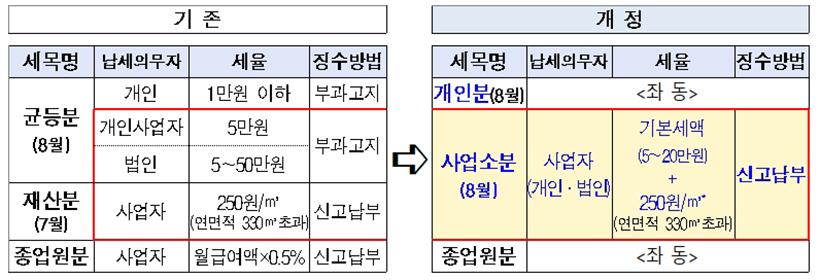 ±âÁ¸ º¹ÀâÇÑ Áֹμ¼ °ú¼¼Ã¼°è¸¦ ȹ±âÀûÀ¸·Î ´Ü¼øÈÇϰí, ³³¼¼ Ƚ¼ö Ãà¼Ò¿Í ³³±â ÅëÀÏ·Î ³³¼¼ÆíÀǸ¦ À§ÇØ »ç½Ç»ó 5°³·Î ±¸¼ºµÈ ÇöÇà ¼¼¸ñÀ» 3°³·Î ´ëÆø °£¼ÒÈÇß°í, Áֹμ¼ ³³±â¸¦ 8¿ù·Î ÅëÀÏÇß´Ù. Àç»êºÐ ¸íĪÀÇ °æ¿ì¡®»ç¾÷¼ÒºÐ¡¯À¸·Î ¸íÈ®ÈÇϰí ¡¼ö¹æ¹ýµµ ºÎ°ú°íÁö¿¡¼ ½Å°í¼¼¸ñÀ¸·Î º¯°æÇß´Ù.
