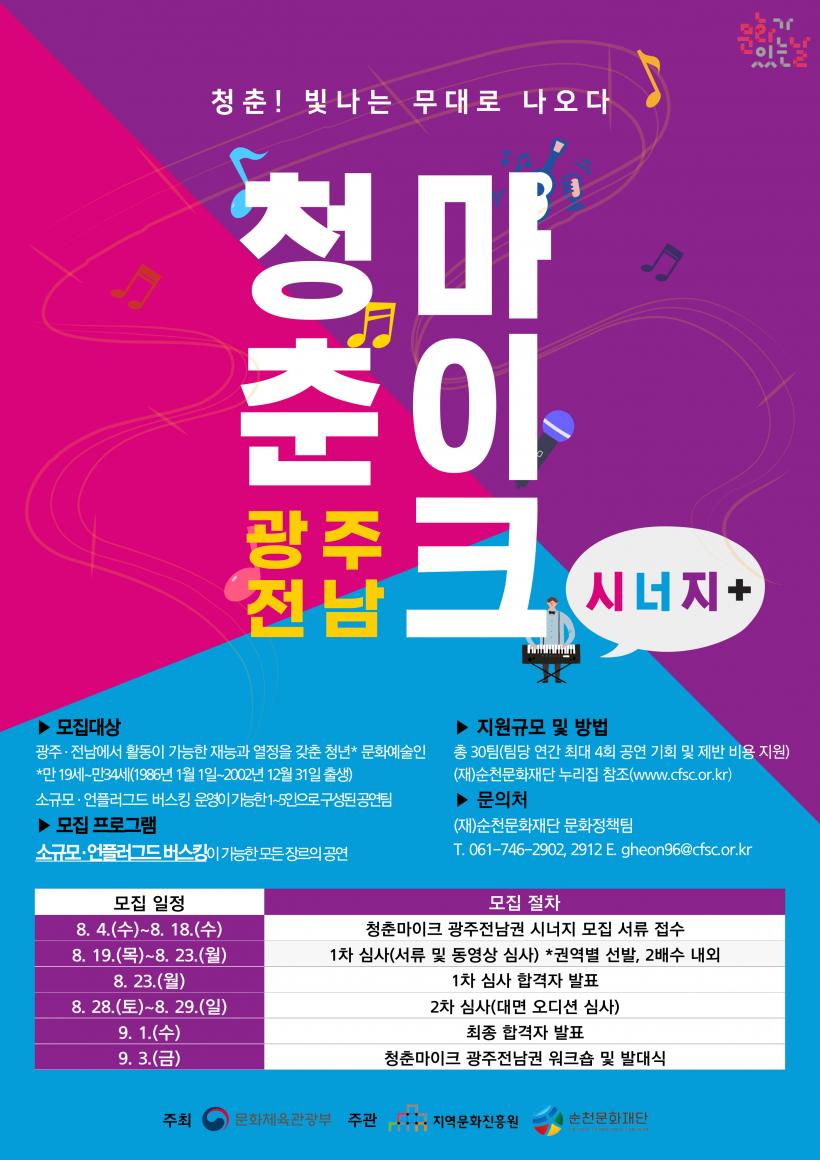 Âü¿©ÀÚ Ãß°¡¸ðÁýÀº ÀÌ´Þ 4ÀϺÎÅÍ 18ÀϱîÁö ÁøÇàµÇ¸ç, ±¤ÁÖ, Àü³²¿¡¼ Ȱµ¿ÀÌ °¡´ÉÇÑ Àü±¹ÀÇ Àç´É°ú ¿Á¤À» °®Ãá û³â ¹®È¿¹¼úÀÎ(¸¸ 19¼¼~¸¸ 34¼¼)À¸·Î ±¸¼ºµÈ ¼Ò±Ô¸ð(1ÀÎ~5ÀÎ) ¹ö½ºÅ· °ø¿¬ÆÀÀÌ¸é ¸ðµÎ ½ÅûÇÒ ¼ö ÀÖ´Ù.