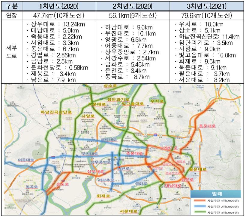 »ç¾÷´ë»ó Áö¿ªÀº ±³Åë»ç°í ¹ß»ýÀÌ ÀæÀº ½Ã³» ÁÖ¿ä °£¼±µµ·Î¿Í ½Åµµ½Ã ¹× »ê¾÷´ÜÁö °³¹ßÁö¿ª ¿¬°áµµ·ÎÀ̸ç, 1Â÷ ³âµµ »ó¹«´ë·Î µî 10³ë¼±(47.7§°), 2Â÷³âµµ Çϳ²´ë·Î µî 9°³ ³ë¼±(56.11§°)ÀÇ ÀÎÇÁ¶ó ±¸ÃàÀ» ¿Ï·áÇßÀ¸¸ç, 3Â÷³âµµÀÎ ¿ÃÇØ ¸»±îÁö ¿ìÄ¡·Î µî 8°³ ³ë¼±(79.6§°) ÀÎÇÁ¶ó ±¸ÃàÀ» ÃßÁøÇϰí ÀÖ´Ù.