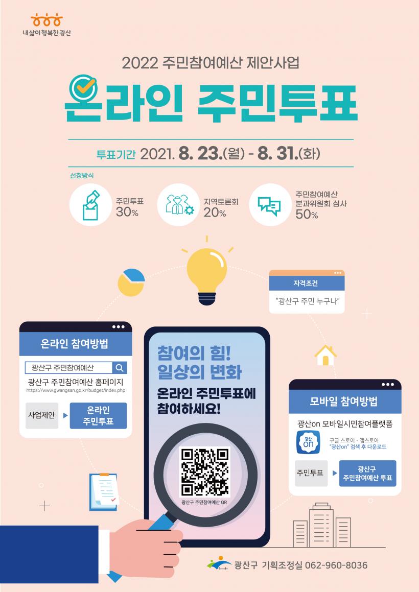 À̹ø ÅõÇ¥´Â 23ÀϺÎÅÍ 31ÀϱîÁö ±¤»ê±¸ ÁÖ¹ÎÂü¿©¿¹»ê ȨÆäÀÌÁö(https://www.gwangsan.go.kr/budget/)¿Í ¸ð¹ÙÀϽùÎÂü¿©Ç÷§Æû ¡®±¤»êon¡¯¿¡¼ ÁøÇàµÈ´Ù.