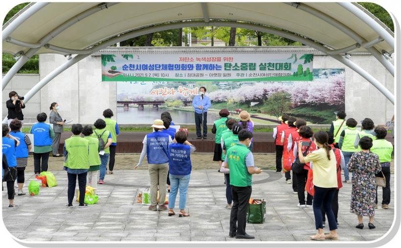[°ø°£´º½º = ±è´ë¿µ±âÀÚ] ¼øÃµ½Ã¿©¼º´ÜüÇùÀÇȸ(ȸÀå ÃÖ°æÈñ)´Â 2ÀÏ ¼øÃµ ¾Æ·§Àå¿¡¼ Àü Áö±¸Àû ±âÈÄ À§±âÀÇ ´ë¾ÈÀÎ 2050 ź¼ÒÁ߸³ ½Çõ¹®È¸¦ È®»ê½Ã۱â À§ÇØ Àå¹Ù±¸´Ï ³ª´® Çà»ç¸¦ ÆîÃÆ´Ù.