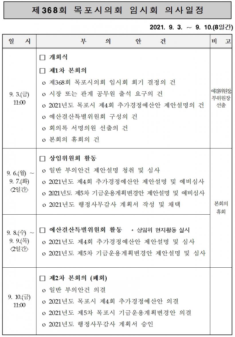 [°ø°£´º½º = ±è¿ëÁø±âÀÚ] ¸ñÆ÷½ÃÀÇȸ(ÀÇÀå ¹Úâ¼ö)´Â 3ÀϺÎÅÍ 10ÀϱîÁö 8Àϰ£ÀÇ ÀÏÁ¤À¸·Î Á¦368ȸ ÀÓ½Ãȸ¸¦ ¿î¿µÇÑ´Ù.