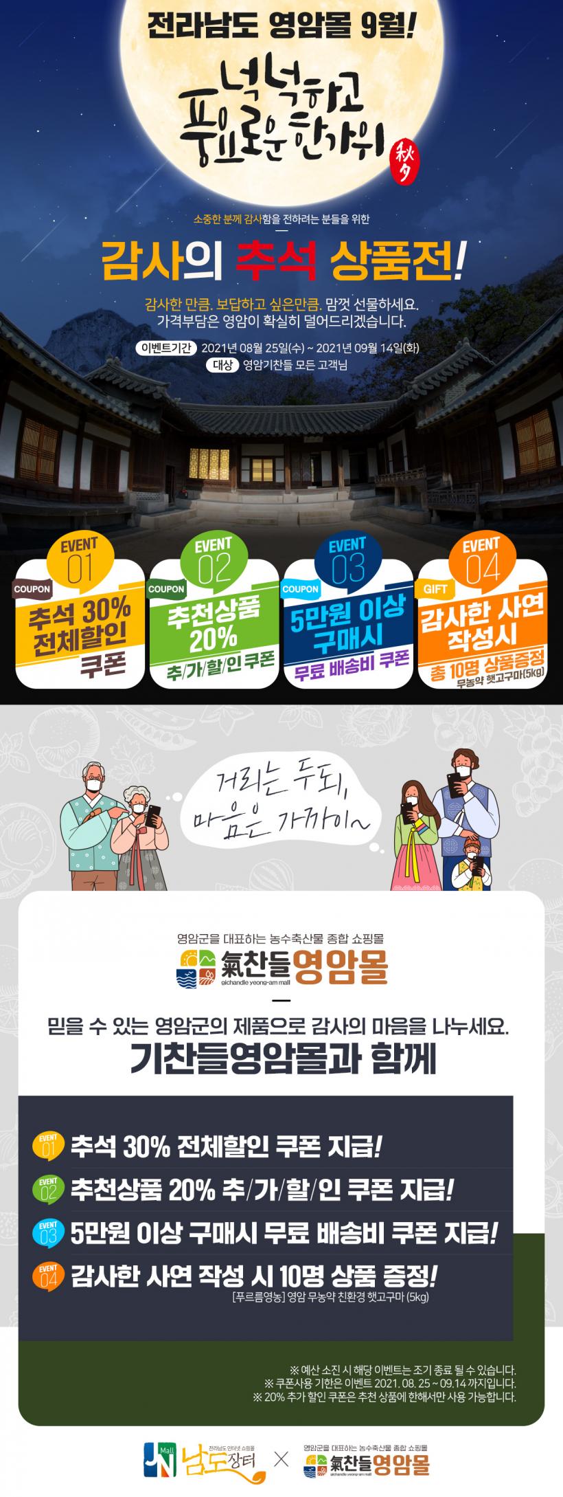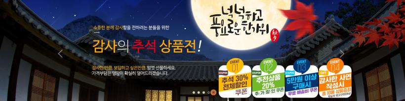 À̹ø ±âȹÀüÀº Áö³ 8¿ù 25ÀϺÎÅÍ ½ÃÀÛÇßÀ¸¸ç 9¿ù 14ÀϱîÁö ÁøÇàµÈ´Ù. Ãß¼®À» ¸Â¾Æ °¨»çÀÇ ¸¶À½À» ³ª´ ¼ö ÀÖ´Â ¿µ¾Ï¸Å·ÂÇÑ¿ì, ¹è, ¸á·Ð, ¹«È°ú µî ¿µ¾Ï±º ´ëÇ¥ ³óƯ»ê¹° ¼±¹°¼¼Æ®·Î ±¸¼ºµÇ¾î ÀÖ´Ù.
