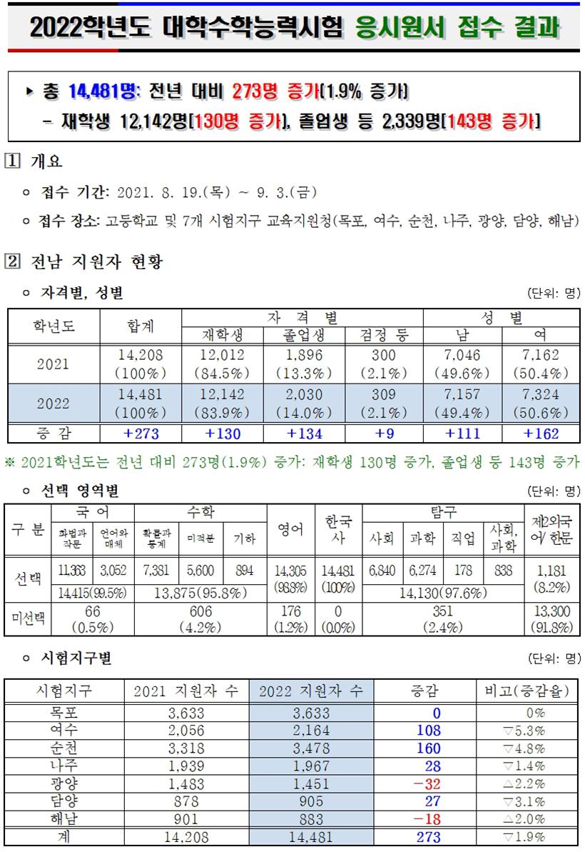 [°ø°£´º½º = ±è¼ö±Ù±âÀÚ] Àü¶ó³²µµ±³À°Ã»(±³À°°¨ Àå¼®¿õ)ÀÌ ¿À´Â 11¿ù 18ÀÏ(¸ñ) ½Ç½ÃµÇ´Â ¡®2022Çг⵵ ´ëÇмöÇдɷ½ÃÇ衯 Àü³² Áö¿ª ÀÀ½Ã¿ø¼ Á¢¼ö °á°ú¸¦ 6ÀÏ(¿ù) ¹ßÇ¥Çß´Ù.
