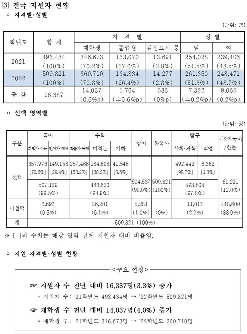 ◦¿µ¿ªº°·Î´Â ±¹¾î¿µ¿ª 1¸¸ 4,415¸í(99.5%), ¼öÇпµ¿ª 1¸¸ 3,875¸í(95.8%), ¿µ¾î¿µ¿ª 1¸¸ 4,305¸í(98.8%), Çʼö ¿µ¿ªÀÎ Çѱ¹»ç¿µ¿ª 1¸¸ 4,481(100%), ޱ¸¿µ¿ª 1¸¸ 4,130¸í(97.6%), Á¦2¿Ü±¹¾î/Çѹ®¿µ¿ª 1,181¸í(8.2%) µîÀ¸·Î ³ªÅ¸³µ´Ù.