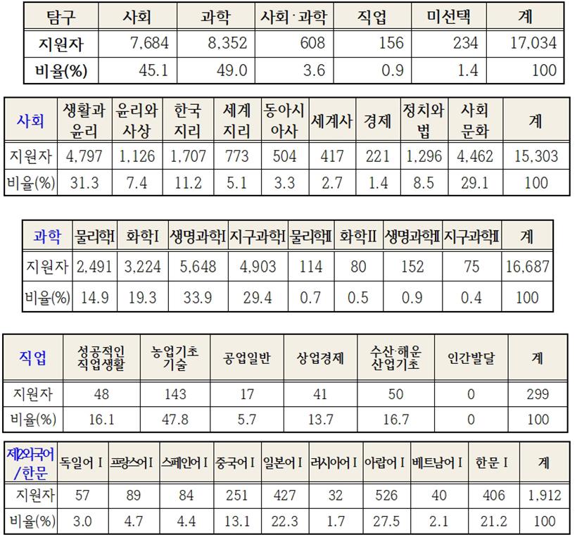 ¡®¿µ¾î(Àý´ëÆò°¡)¡¯ÀÇ °æ¿ì 1¸¸6,921¸í(99.3%), ¹Ì¼±Åà 113¸í(0.7%)À¸·Î Áý°èµÆ´Ù.¼ö´É Çʼö ÀÀ½Ã °ú¸ñÀÎ ¡®Çѱ¹»ç¡¯ÀÇ °æ¿ì Àüü Áö¿øÀÚÀÎ 1¸¸7,034¸íÀÌ ¼±ÅÃÇß´Ù.