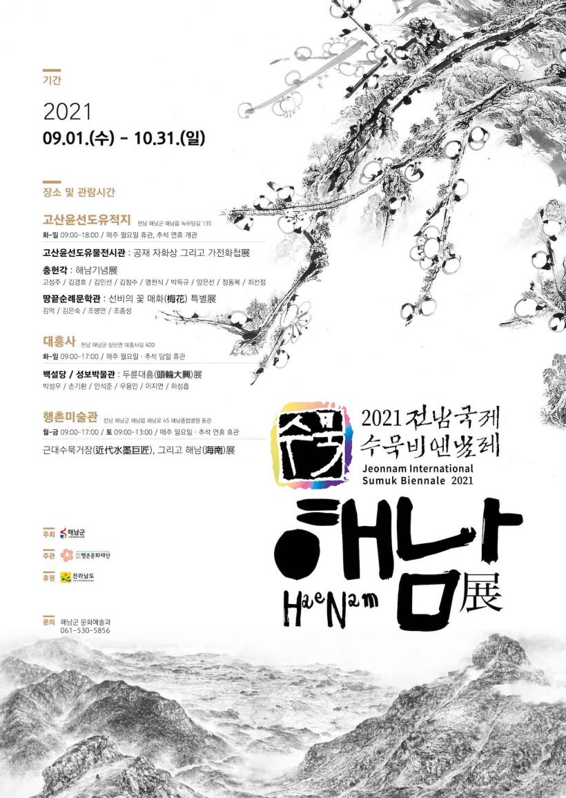 Àü½Ãȸ °ü·Ã ¹®ÀÇ´Â ÇØ³²±º ¹®È¿¹¼ú°ú(¢Ï061-530-5856)·Î ÇÏ¸é µÇ¸ç, ÀÚ¼¼ÇÑ Àü½Ã ÀÏÁ¤Àº ÇØ³²¹®È¿¹¼úȸ°ü ȨÆäÀÌÁö(https://art.haenam.go.kr)¿¡¼ È®ÀÎÇÏ¸é µÈ´Ù.
