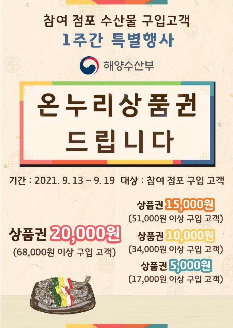 ¼ö»ê¹° ÆÇ¸Å ÃËÁø ¹× ÀüÅë½ÃÀå Ȱ¼ºÈ ÀÏȯÀ¸·Î ÃßÁøµÇ´Â À̹ø ÇÒÀÎÇà»ç´Â ¸ñÆ÷½Ã¿Í ÇØ¾ç¼ö»êºÎ°¡ Äڷγª19 Àå±âÈ·Î ¾î·Á¿òÀ» °Þ°í ÀÖ´Â ¼ö»ê¾÷°è¸¦ Áö¿øÇϱâ À§ÇØ ÃßÁøÇÏ´Â ¡®2021³â ´ëÇѹα¹ ¼ö»ê´ëÀü¡¯ »ó»ýÇÒÀÎ Áö¿ø»ç¾÷À» ÅëÇØ ÁøÇàµÈ´Ù.
