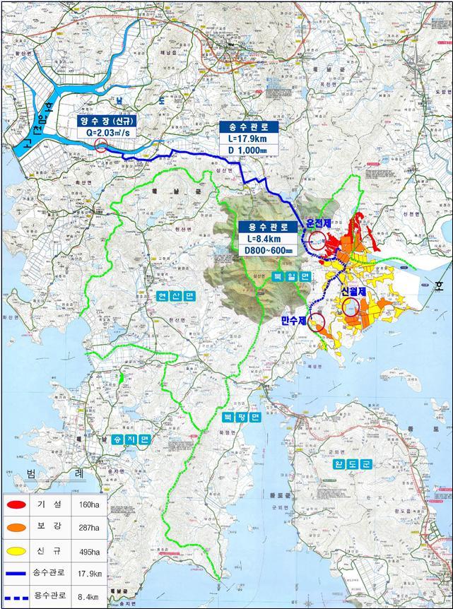 À̹ø »ç¾÷À» ÅëÇØ ¾ç¼öÀå°ú 17kmÀÇ ¼Û¼ö°ü·Î¸¦ ¸Å¼³ÇØ ºÏÀÏ¸é ¿îÀüÀú¼öÁö¿Í ½Å¿ùÀú¼öÁö, ¸¸¼öÀú¼öÁö µî 3°³ Àú¼öÁö¿¡ ¿ë¼ö¸¦ °ø±ÞÇÏ°Ô µÈ´Ù. ±ºÀº Âø¼öº¸°íȸ¿¡ ÀÌ¾î ¿ÃÇØ Áß ±âº»Á¶»ç ¿ë¿ªÀ» ¸¶¹«¸®Çϰí, ³»³â ±âº» ¹× ½Ç½Ã¼³°è¸¦ °ÅÃÄ 2023³â Âø°øÇÒ °èȹÀÌ´Ù.