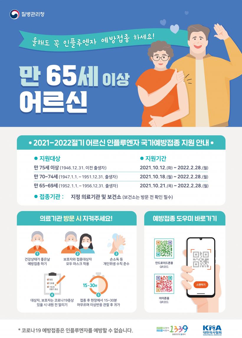 ¸¸ 75¼¼ ÀÌ»ó ¾î¸£½ÅÀº 10¿ù 12ÀϺÎÅÍ, ¸¸ 70~74¼¼´Â 10¿ù 18ÀϺÎÅÍ, ¸¸ 65~69¼¼´Â 10¿ù 21ÀϺÎÅÍ Áö¿ª À§Å¹ ÀÇ·á±â°ü 30°÷¿¡¼ Á¢Á¾À» ÁøÇàÇϰí 12°³ ¸é Áö¿ª º¸°ÇÁö¼Ò¿¡¼µµ Á¢Á¾ÇÒ ¼ö ÀÖ´Ù.