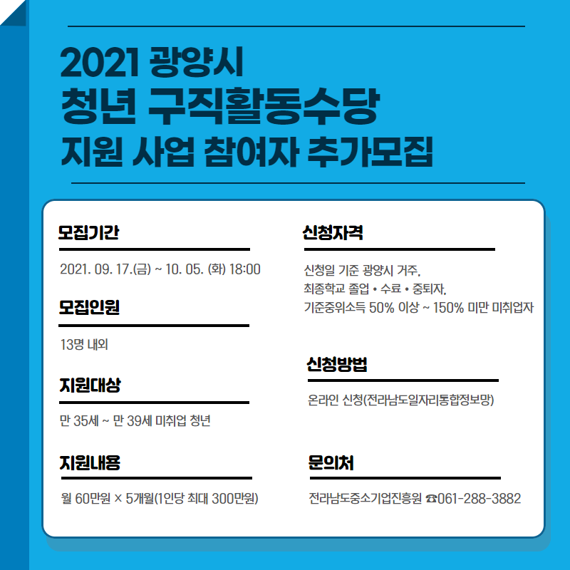 [°ø°£´º½º = ±è´ë¿µ±âÀÚ] ±¤¾ç½Ã´Â ¿À´Â 10¿ù 5ÀϱîÁö û³â ±¸Á÷Ȱµ¿¼ö´ç Áö¿ø»ç¾÷ÀÇ Âü¿©ÀÚ¸¦ Ãß°¡ ¸ðÁýÇÑ´Ù.