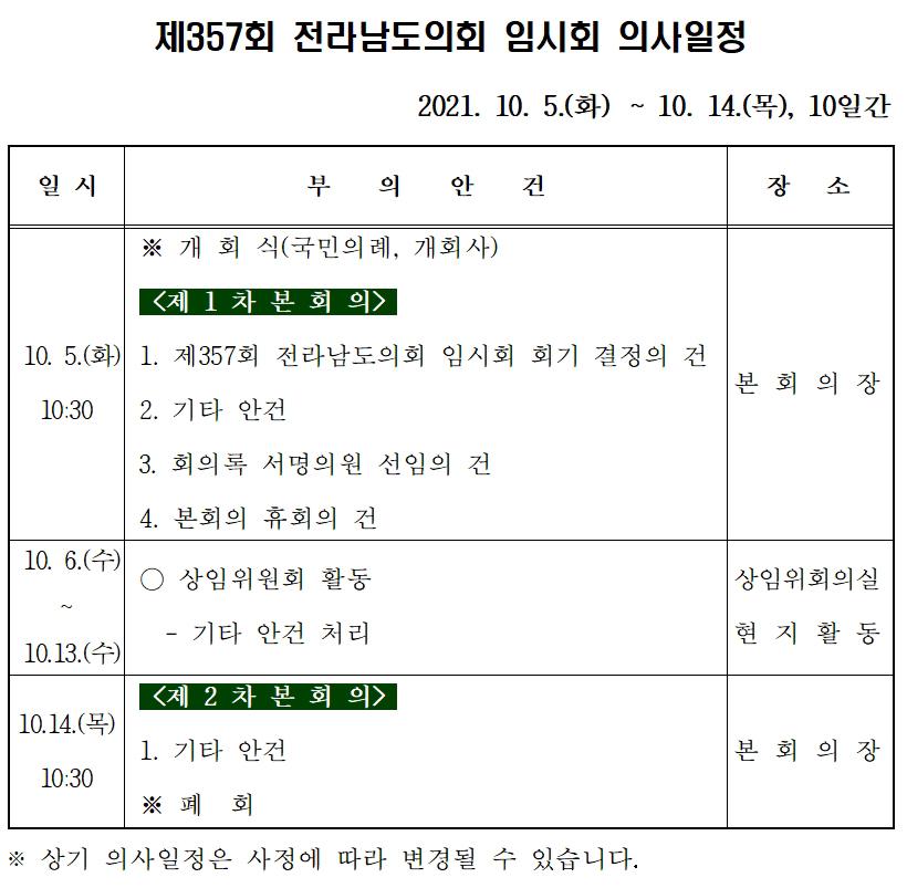 [°ø°£´º½º = ±è¼ö±Ù±âÀÚ] Àü¶ó³²µµÀÇȸ(ÀÇÀå ±èÇÑÁ¾)´Â ¿À´Â 10¿ù 5ÀϺÎÅÍ 14ÀϱîÁö 10Àϰ£ÀÇ ÀÏÁ¤À¸·Î Á¦357ȸ ÀÓ½Ãȸ¸¦ ¿î¿µÇÑ´Ù.