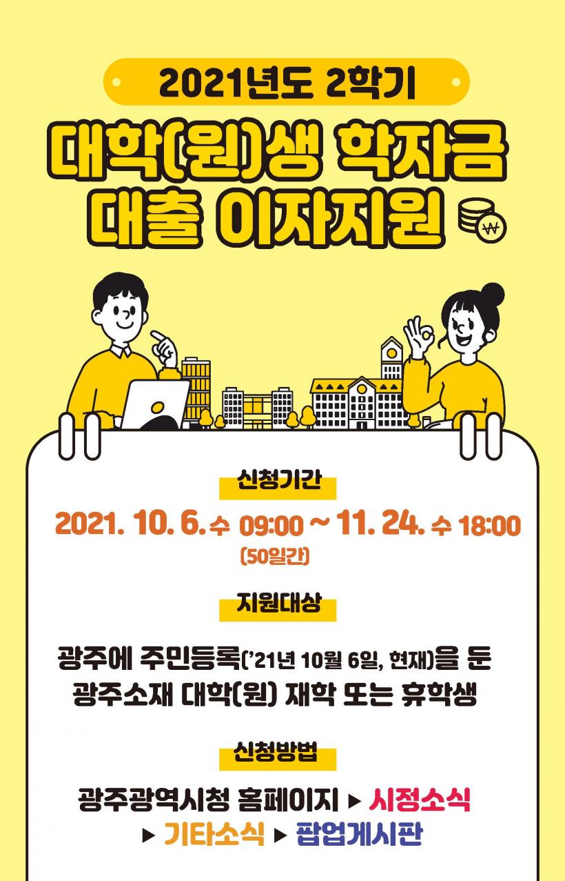 [°ø°£´º½º = ±è¼ö±Ù±âÀÚ] ±¤ÁÖ±¤¿ª½Ã´Â 6ÀϺÎÅÍ ¿À´Â 11¿ù24ÀϱîÁö 2021³â 2Çб⠴ëÇÐ(¿ø)»ý ÇÐÀÚ±Ý ´ëÃâÀÌÀÚ Áö¿ø ½ÅûÀ» Á¢¼öÇÑ´Ù.