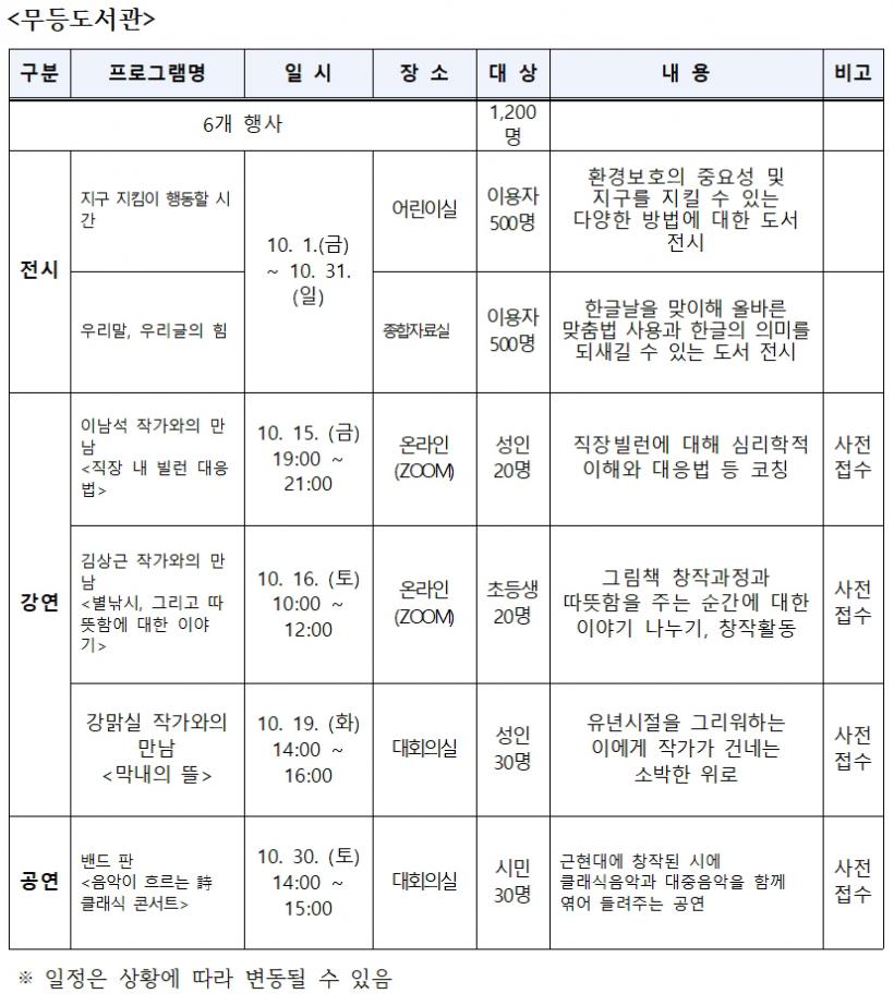 ¸ÕÀú, ¹«µîµµ¼°ü¿¡¼´Â ¡ãÃʵîÇлý ´ë»ó ¡®º°³¬½Ã ±×¸®°í µû¶æÇÔ¿¡ ´ëÇÑ À̾߱⡯(±è»ó±Ù ÀÛ°¡) ¡ãÁ÷ÀåÀÎ ´ë»ó ¡®Á÷Àå ³» ºô·± ´ëÀÀ¹ý ÄÚĪ¡¯(À̳²¼® ÀÛ°¡)À» ºñ´ë¸é(ZOOM)À¸·Î ÁøÇàÇÏ°í ¡ãÀ½¾ÇÀÌ È帣´Â ½Ã Ŭ·¡½Ä °ø¿¬(¹êµå ÆÇ)À» ´ë¸éÀ¸·Î ¿î¿µÇÑ´Ù.