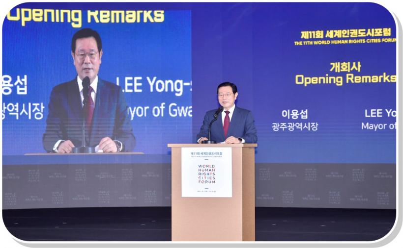 | À̿뼷 ±¤ÁÖ±¤¿ª½ÃÀåÀÌ 7ÀÏ ¿ÀÈÄ ±è´ëÁßÄÁº¥¼Ç¼¾ÅÍ¿¡¼ ºñ´ë¸é ¹æ½ÄÀ¸·Î ÁøÇàµÈ 'Á¦11ȸ ¼¼°èÀαǵµ½ÃÆ÷·³' ¶ó¿îµåÅ×ÀÌºí¿¡ Âü¼®ÇØ 'À糿¡ ¸Â¼´Â Àαǵµ½ÃµéÀÇ »õ·Î¿î ¿ªÇÒ'À» ÁÖÁ¦·Î ¹ßÁ¦Çϰí ÀÖ´Ù. |