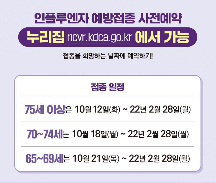 Á¢Á¾´ë»óÀÚ°¡ ÇѲ¨¹ø¿¡ ¸ô¸®´Â °ÍÀ» ¸·±â À§ÇØ ¿¬·Éº° Á¢Á¾À» ½Ç½ÃÇÑ´Ù. ¸¸ 75¼¼ ÀÌ»ó ¾î¸£½ÅÀº 10¿ù 12ÀϺÎÅÍ, ¸¸ 70~74¼¼ ¾î¸£½ÅÀº 10¿ù 18ÀϺÎÅÍ, ¸¸ 65~69¼¼ ¾î¸£½ÅÀº 10¿ù 21ÀϺÎÅÍ Á¢Á¾¹ÞÀ» ¼ö ÀÖ´Ù.