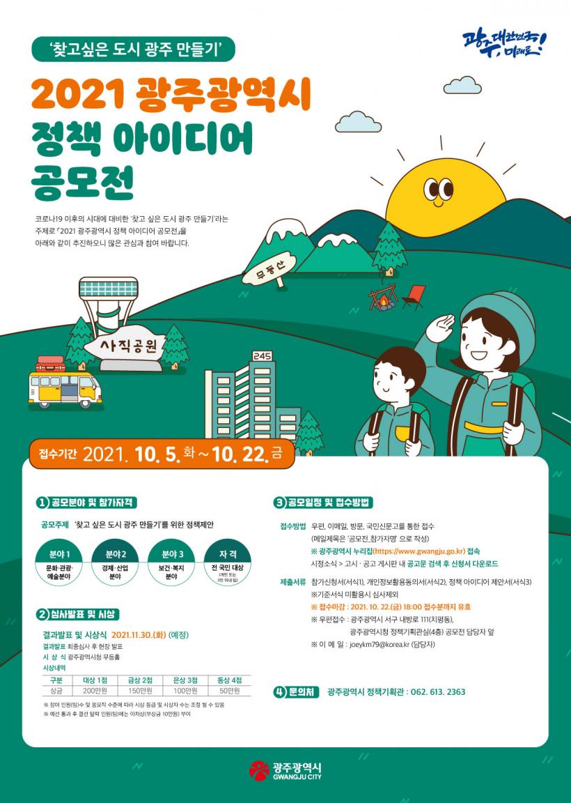À̹ø °ø¸ð´Â ¡®Ã£°í ½ÍÀº µµ½Ã ±¤ÁÖ ¸¸µé±â¸¦ À§ÇÑ Á¤Ã¥ Á¦¾È¡¯À̶ó´Â ÁÖÁ¦·Î ¡ã¹®È‧°ü±¤‧¿¹¼úºÐ¾ß ¡ã°æÁ¦‧»ê¾÷ºÐ¾ß ¡ãº¸°Ç‧º¹ÁöºÐ¾ß µî 3°³ ºÐ¾ßÀ̸ç, 22ÀϱîÁö Á¢¼öÇÑ´Ù.