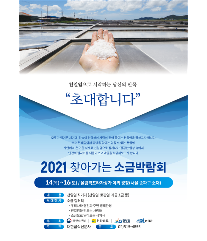 [°ø°£´º½º = ±è¼ö±Ù±âÀÚ] Àü¶ó³²µµ´Â ÇØ¾ç¼ö»êºÎ, ¿µ±¤±º, ½Å¾È±º°ú ÇÔ²² 14ÀϺÎÅÍ 3Àϰ£ ¼¿ï ¿Ã¸²ÇÈÇÁ¶óÀÚ ¾ß¿Ü ±¤Àå¿¡¼ Àü³²»ê ¸íǰ õÀÏ¿°ÀÇ °¡Ä¡¿Í ¿ì¼ö¼ºÀ» ¾Ë¸®´Â ¡®2021 ¼Ò±Ý¹Ú¶÷ȸ¡¯¸¦ °³ÃÖÇÑ´Ù.
