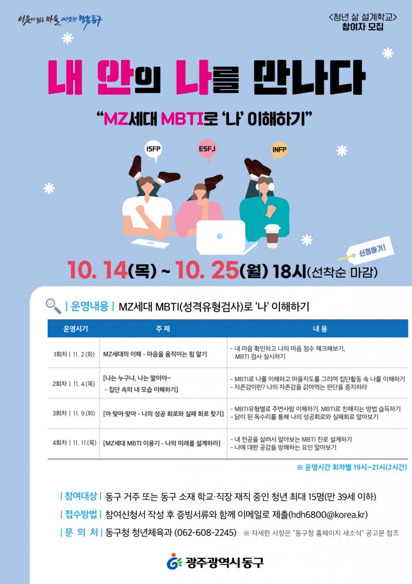 ÀÓÅà µ¿±¸Ã»ÀåÀº ¡°ÀÌ ½Ã´ë¸¦ °¡Àå Èûµé°Ô °í¹ÎÇÏ¸é¼ »ì°í ÀÖ´Â ¼¼´ë°¡ ¹Ù·Î û³âÃþÀÏ °Í¡±À̶ó¸é¼ ¡°MBTI °Ë»ç¸¦ ÅëÇØ ¿Ã¹Ù¸¥ ÀÚ±âºÐ¼®Àº ¹°·Ð Áø·Î¡¤Ãë¾÷ µî º¸´Ù Àû±ØÀûÀ¸·Î ÀλýÀ» ¼³°èÇÒ ¼ö ÀÖ´Â ±âȸ°¡ µÇ±æ ¹Ù¶õ´Ù¡±°í ¸»Çß´Ù.