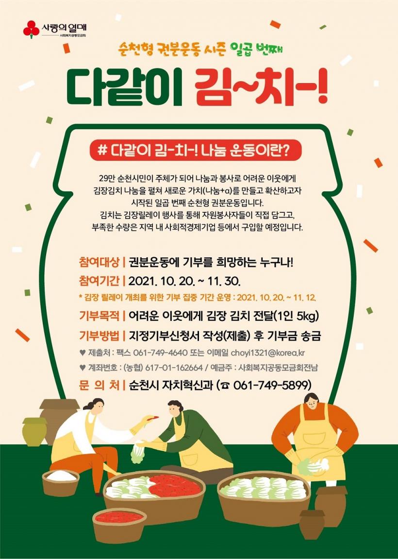 ¼øÃµÇü ±ÇºÐ¿îµ¿ ½ÃÁð7 ¡®´Ù°°ÀÌ ±è-Ä¡-!¡¯´Â ³ª´®°ú ºÀ»ç·Î 29¸¸ ¼øÃµ½Ã¹ÎÀÌ ³ª´® ±× ÀÌ»óÀÇ »õ·Î¿î °¡Ä¡¸¦ ¸¸µé°í È®»êÇÏÀÚ´Â ÃëÁö¿¡¼ ½ÃÀ۵ƴÙ.