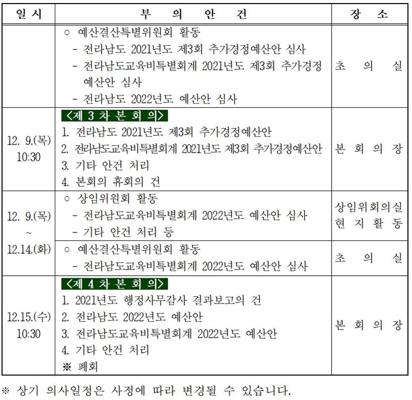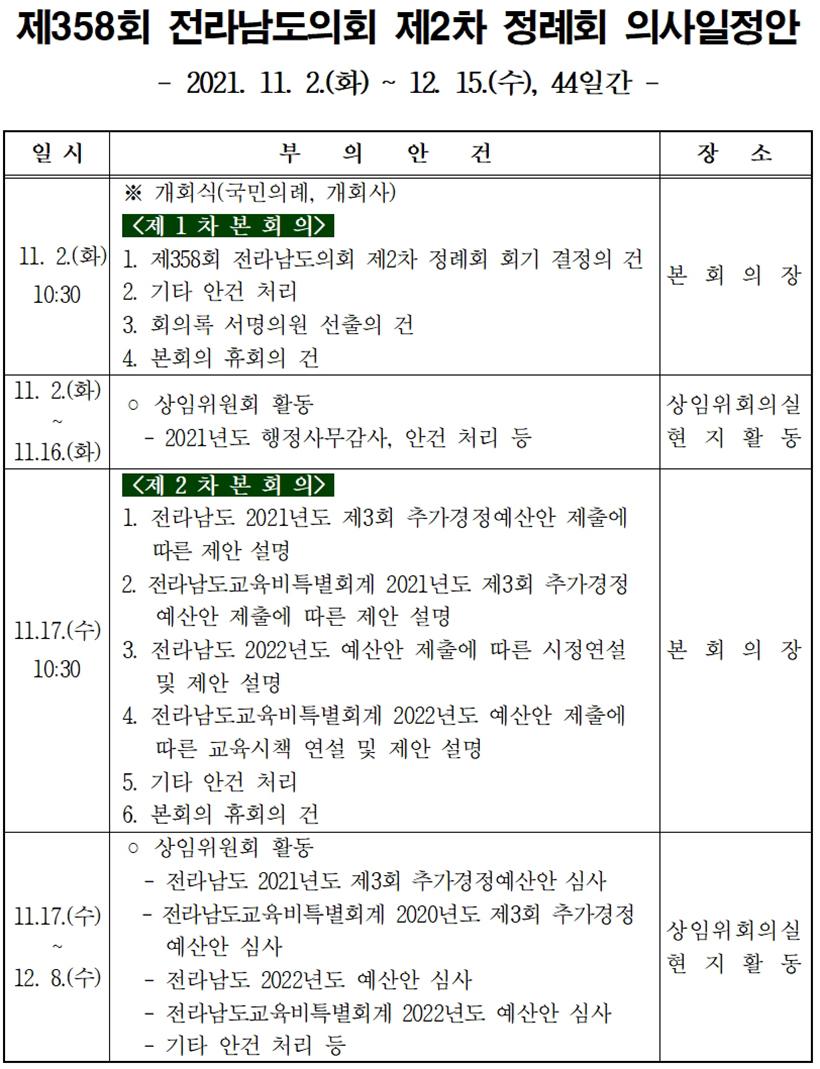 [°ø°£´º½º = ±è¼ö±Ù±âÀÚ] Àü¶ó³²µµÀÇȸ(ÀÇÀå ±èÇÑÁ¾)´Â ¿À´Â 11¿ù 2ÀÏ ¿ÀÀü 10½Ã 30ºÐ, µµÀÇȸ º»È¸ÀÇÀå¿¡¼ Á¦358ȸ Á¦2Â÷ Á¤·Êȸ¸¦ °³È¸Çϰí 12¿ù 15ÀϱîÁö 44Àϰ£ÀÇ ÀÏÁ¤À¸·Î ¿ÃÇØ ¸¶Áö¸· ȸ±â¸¦ ¿î¿µÇÑ´Ù.