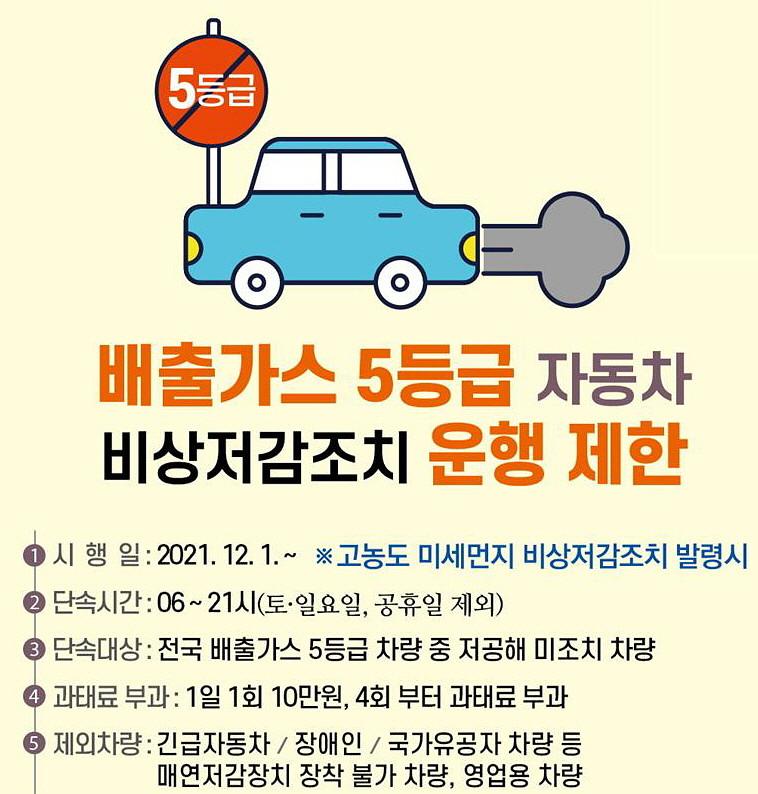 [°ø°£´º½º = ±è´ë¿µ±âÀÚ] ±¤¾ç½Ã´Â ¿À´Â 12¿ù 1ÀϺÎÅÍ ´ë±âÁú °³¼±°ú ¹Ì¼¼¸ÕÁö Àú°¨À» À§ÇØ ¡®°í³óµµ ¹Ì¼¼¸ÕÁö ºñ»óÀú°¨Á¶Ä¡¡¯ ¹ß·É ½Ã ¹èÃâ°¡½º 5µî±Þ Â÷·®ÀÇ ¿îÇàÀ» Á¦ÇÑÇÑ´Ù.