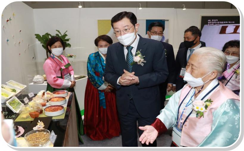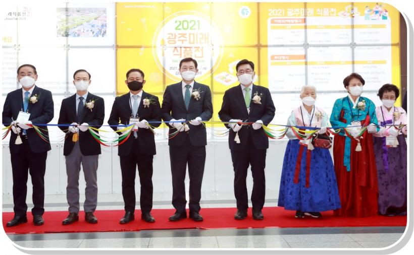 | À̿뼷 ±¤ÁÖ±¤¿ª½ÃÀåÀÌ 4ÀÏ ¿ÀÈÄ ¼±¸ ±è´ëÁßÄÁº¥¼Ç¼¾ÅÍ¿¡¼ ¿¸° '2021±¤Á̷ֹ¡½ÄǰÀü'¿¡ Âü¼®ÇØ ±èÃáÁø Çѱ¹³ó¼ö»ê½ÄǰÀ¯Åë°ø»ç »çÀå, Á¤ÇØ¿ë ´ë±¸½Ã °æÁ¦ºÎ½ÃÀå µî ³»ºóµé°ú Å×ÀÌÇÁ¸¦ Ä¿ÆÃÇϰí ÀÖ´Ù. |