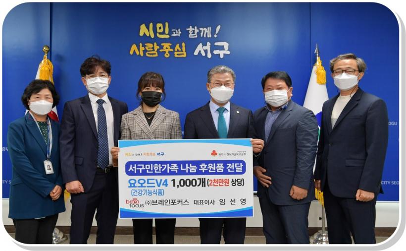 [°ø°£´º½º = ±è¼ö±Ù±âÀÚ] ±¤ÁÖ ¼±¸(±¸Ã»Àå ¼´ë¼®)°¡ Áö³ 9ÀÏ »çȸÀû±â¾÷ÀÎ ¢ßºê·¹ÀÎÆ÷Ä¿½º·ÎºÎÅÍ 2õ¸¸¿ø »ó´çÀÇ ÀÚ»ç °Ç°±â´É½Äǰ(¿ä¿ÀµåV4) 1,000°³¸¦ ÈÄ¿øÇ°À¸·Î Àü´Þ¹Þ¾Ò´Ù°í ¹àÇû´Ù.