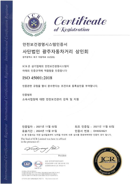 [°ø°£´º½º = ±è´ë¿µ±âÀÚ] ±¤Áֽà ºÏ±¸(±¸Ã»Àå ¹®ÀÎ)ÀÇ (»ç)±¤ÁÖÀÚµ¿Â÷°Å¸® »óÀÎȸ(ȸÀå ÃÖ¿¬¸ð)°¡ Àü±¹ ÀüÅë½ÃÀå・»óÁ¡°¡·Î´Â ÃÖÃÊ·Î ¾ÈÀüº¸°Ç°æ¿µ½Ã½ºÅÛ ¡®ISO 45001¡¯ ÀÎÁõÀ» ȹµæÇß´Ù°í 17ÀÏ ¹àÇû´Ù.
