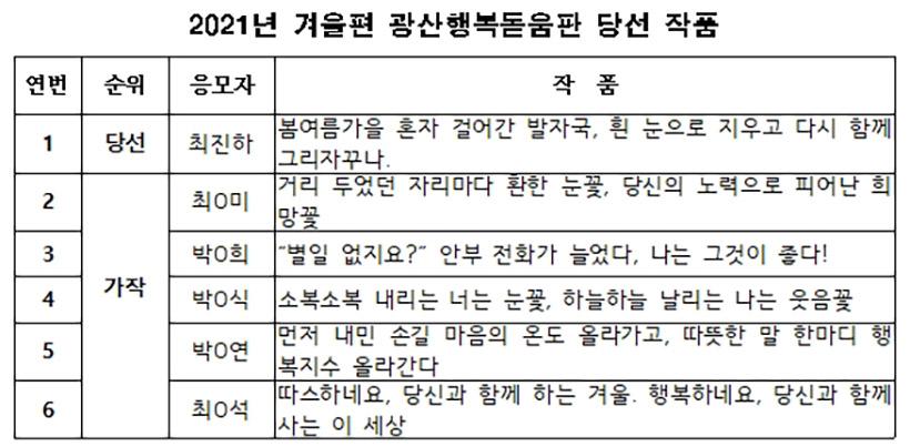 ±¤ÁÖ ±¤»ê±¸(±¸Ã»Àå ±è»ïÈ£)´Â Áö³ 10¿ùºÎÅÍ ÁøÇàÇÑ °Ü¿ïÆí ¹®¾È °ø¸ð¿¡¼ ¼±Á¤µÈ ÃÖÁøÇÏ ¾¾ÀÇ ¡®º½, ¿©¸§, °¡À» È¥ÀÚ °É¾î°£ ¹ßÀÚ±¹, Èò ´«À¸·Î Áö¿ì°í ´Ù½Ã ÇÔ²² ±×¸®ÀÚ²Ù³ª¡¯ÀÇ ´ç¼±ÀÛ µî ÃÑ 6ÆíÀ» Ȱ¿ëÇØ Çູµ¸¿òÆÇÀ» »õ·Ó°Ô ´ÜÀåÇß´Ù°í 3ÀÏ ¹àÇû´Ù.