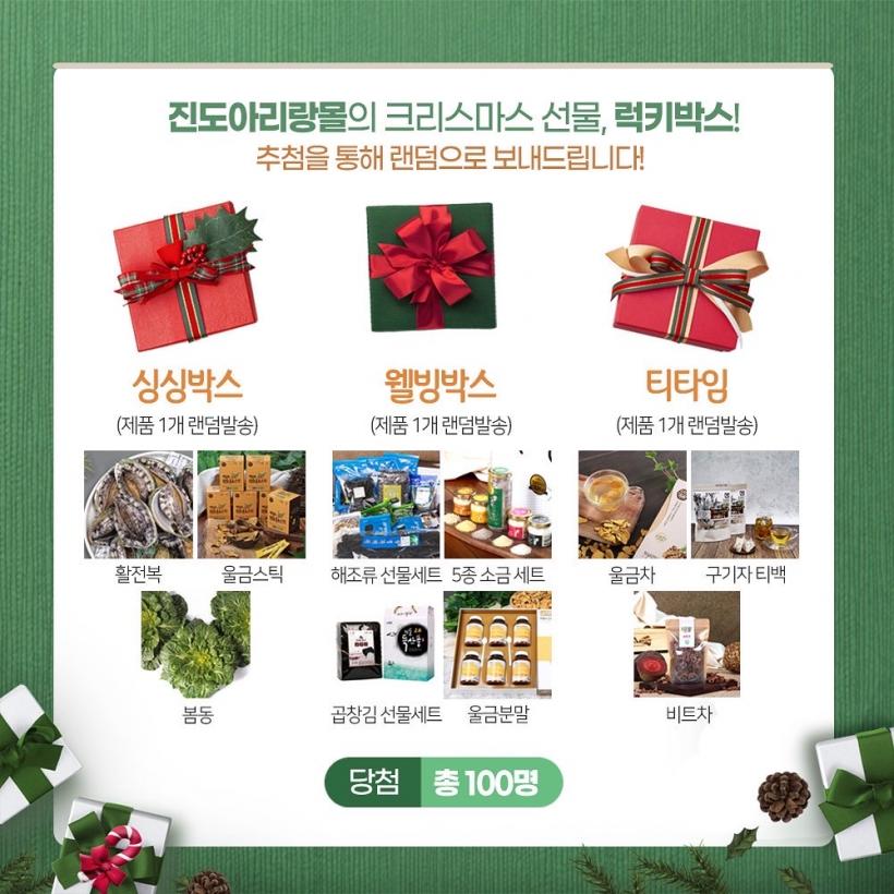 ´ç÷µÈ 100¸í¿¡°Ô ¡ã½Ì½Ì¹Ú½º(ȰÀüº¹, ¿ï±Ý½ºÆ½, º½µ¿) ¡ãÀ£ºù¹Ú½º(ÇØÁ¶·ù ¼±¹°¼¼Æ®, 5Á¾ ¼Ò±Ý ¼¼Æ®, °öâ±è ¼±¹°¼¼Æ® µî) ¡ãƼŸÀÓ(¿ï±ÝÂ÷, ºñÆ®Â÷ µî) Áß ¹«ÀÛÀ§·Î 1°³ÀÇ ¼±¹°ÀÌ Àü´ÞµÈ´Ù.
