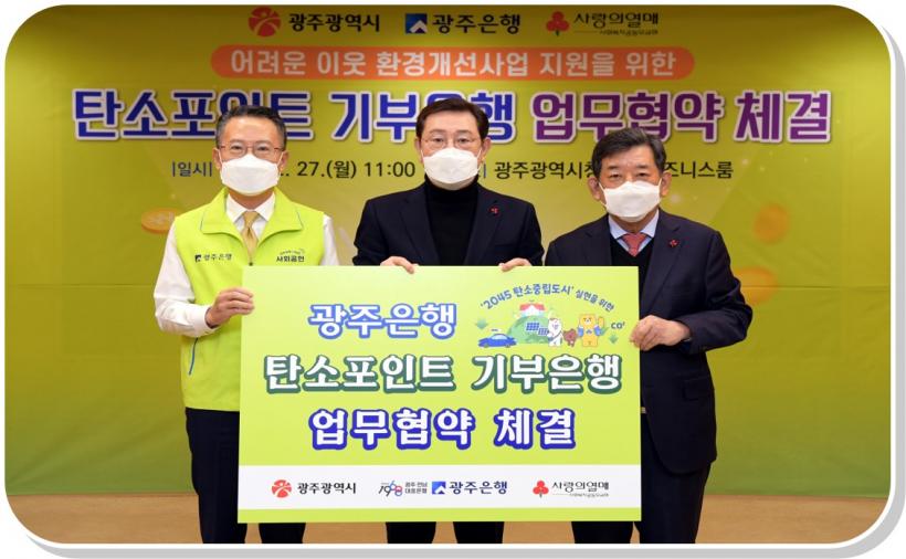 [°ø°£´º½º = ±è¼ö±Ù±âÀÚ] ±¤ÁÖ±¤¿ª½Ã´Â ź¼ÒÆ÷ÀÎÆ®Á¦ ±âºÎÁ¦µµ¸¦ Ȱ¿ëÇÑ Ãë¾à°èÃþ ¹× Ãë¾àÁö¿ª ȯ°æ°³¼±»ç¾÷ °øµ¿Áö¿øÀ» À§ÇØ 27ÀÏ ½Ãû ºñÁî´Ï½º·ë¿¡¼ ±¤ÁÖÀºÇà, ±¤ÁÖ»çȸº¹Áö°øµ¿¸ð±Ýȸ¿Í ¡®Åº¼ÒÆ÷ÀÎÆ® ±âºÎÀºÇà °øµ¿Áö¿ø ¾÷¹«Çù¾à¡¯À» ü°áÇß´Ù.