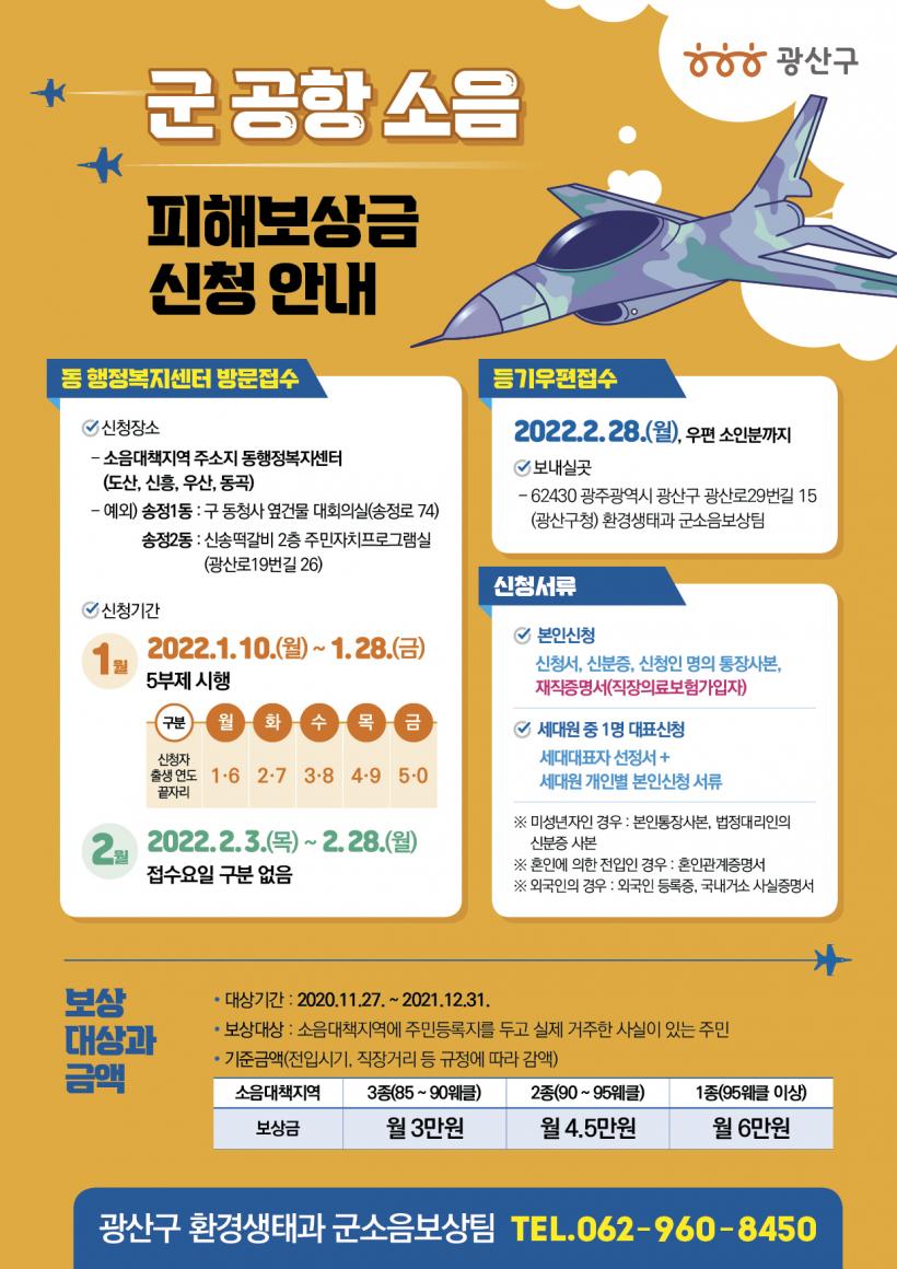 [°ø°£´º½º = ±è´ë¿µ±âÀÚ] ±¤ÁÖ ±¤»ê±¸(±¸Ã»Àå ±è»ïÈ£)´Â ±º¿ëºñÇàÀ塤±º»ç°ÝÀå ¼ÒÀ½¹æÁö ¹× ÇÇÇØº¸»ó¿¡ °üÇÑ ¹ý·ü ½ÃÇà¿¡ µû¶ó ¿À´Â 10ÀϺÎÅÍ 2¿ù28ÀϱîÁö ±º ¼ÒÀ½ ÇÇÇØ º¸»ó ½ÅûÀ» ¹Þ´Â´Ù°í ¹àÇû´Ù.